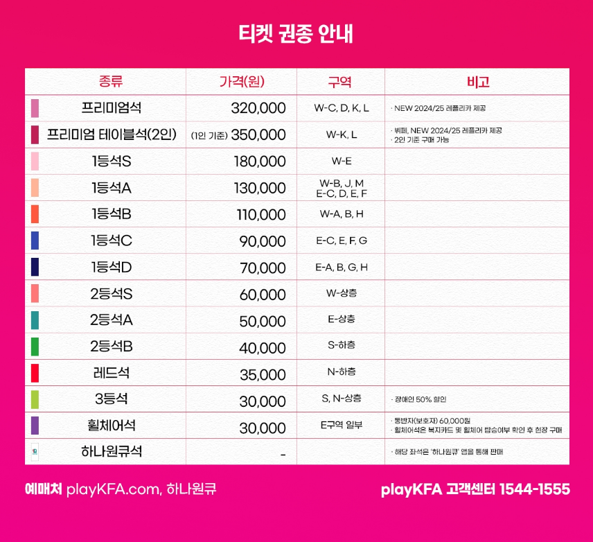 경기장 좌석은 프리미엄석 테이블석부터 1등석 S~D석, 2등석 S~B석, 3등석, 레드석, 휠체어석까지 다양합니다. 가격 또한 1인 35만원부터 3만원까지 다양하게 설정되어 있습니다.