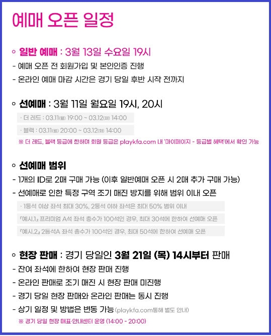 티켓 예매는 선예매와 일반예매로 구분되며 예매 시간은 PLAY KFA 회원 등급에 따라 예매 시간이 다르게 적용됩니다. 현장에서의 티켓 판매는 온라인 예매가 끝나고 난 뒤 잔여좌석이 남아 있는 경우에만 진행합니다.