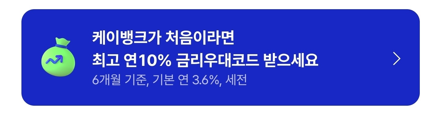 케이뱅크 신규회원에게만 주어지는 코드K 자유적금의 웰컴선물 연 10% 이벤트 놓치지 말고 꼭꼭! 가입하시기를 바랍니다.